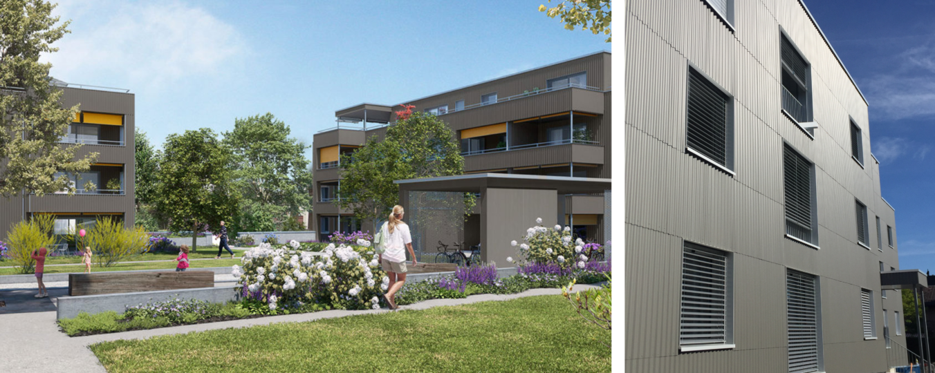Als hochwertiger Schweizer Holzbau trägt der Waldpark das entsprechende Zertifikat. Das zeigen bereits die Fassaden, die von viel Holz geprägt sind, zusätzlich aber auch Elemente aus Metall und Eternit besitzen.